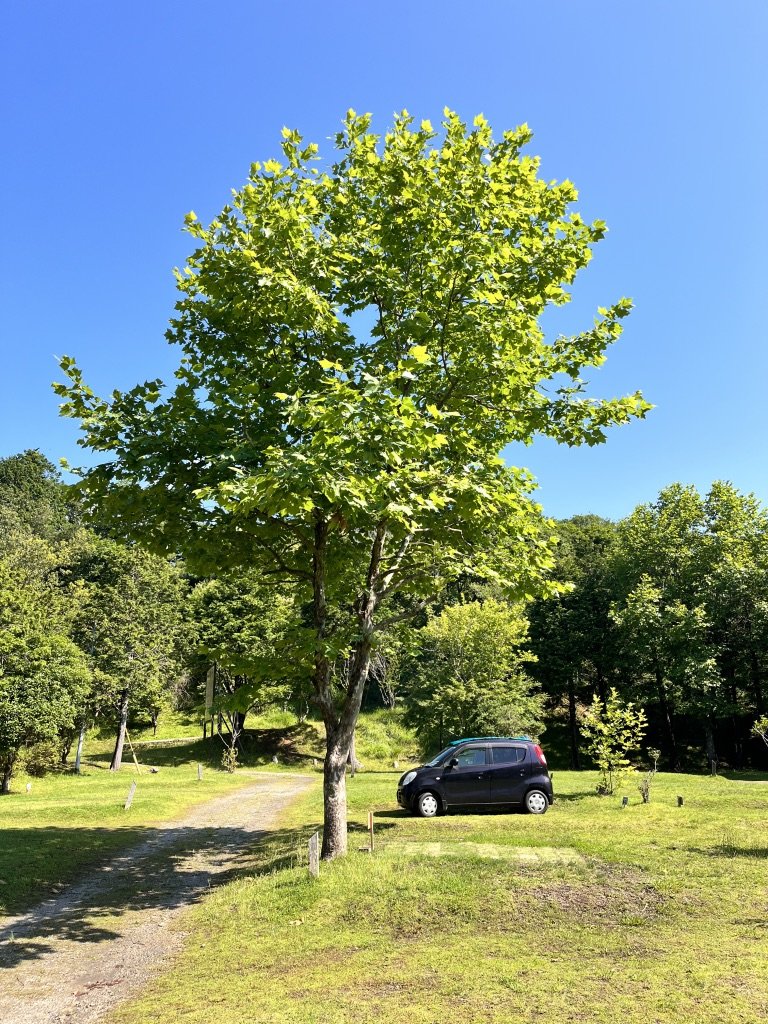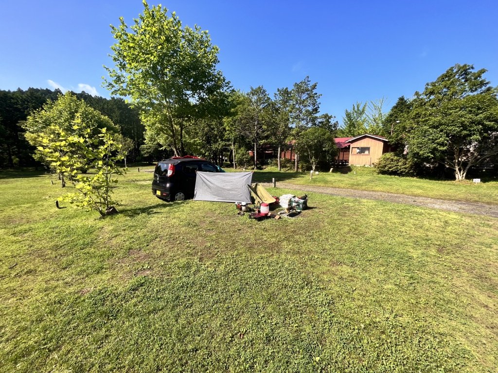思いの外、時間が余ってしまったので、少し一人しかいないキャンプ場でボーっとする。サイトの芝生の青さと木の影のコントラストに目が奪われる。昨日の夜には考えられないような爽やかな風が吹き抜けていく。
