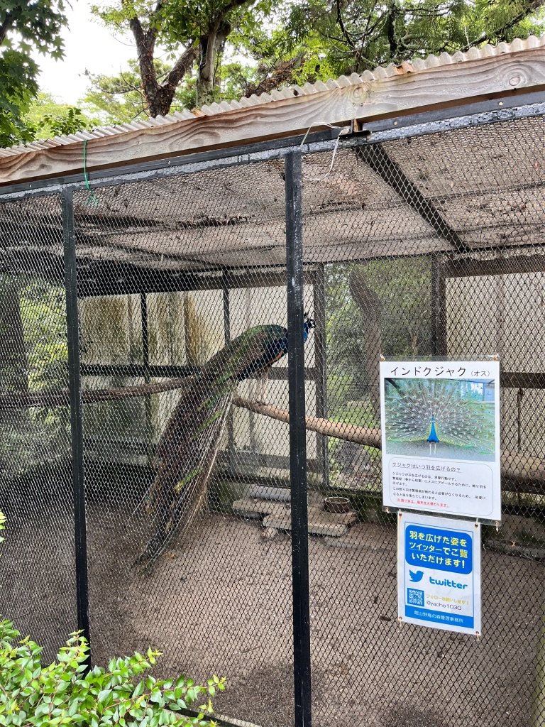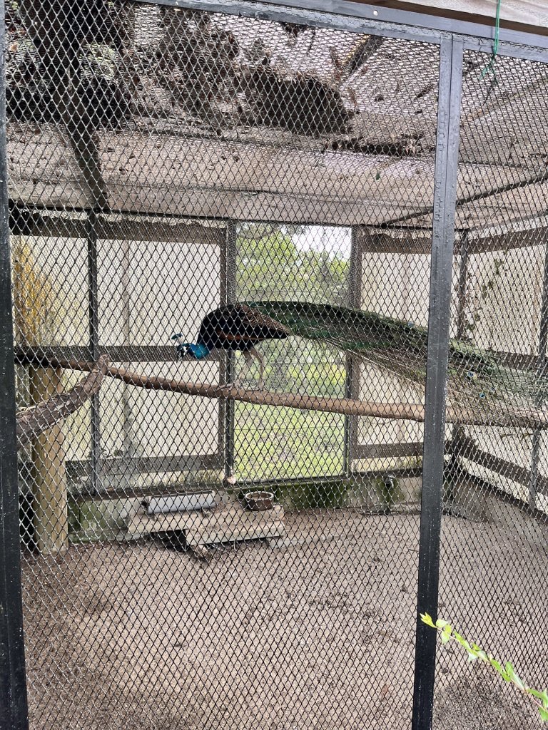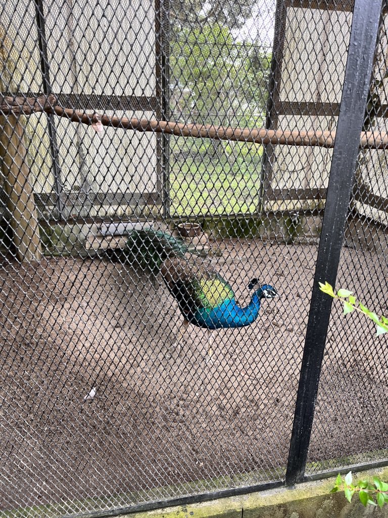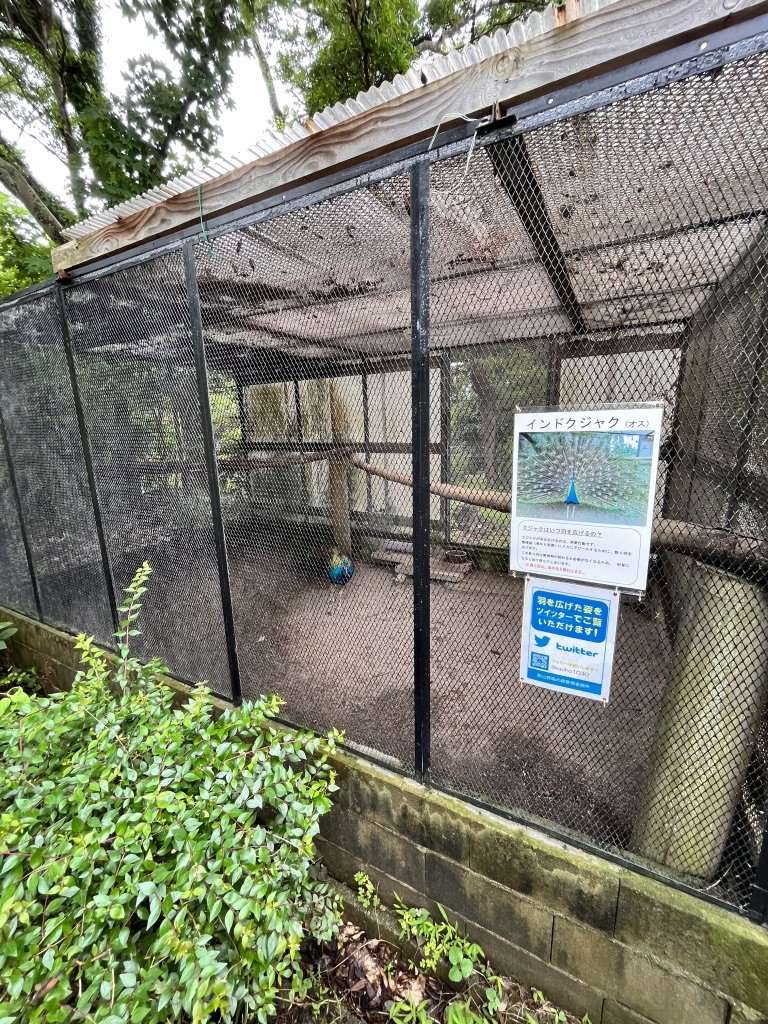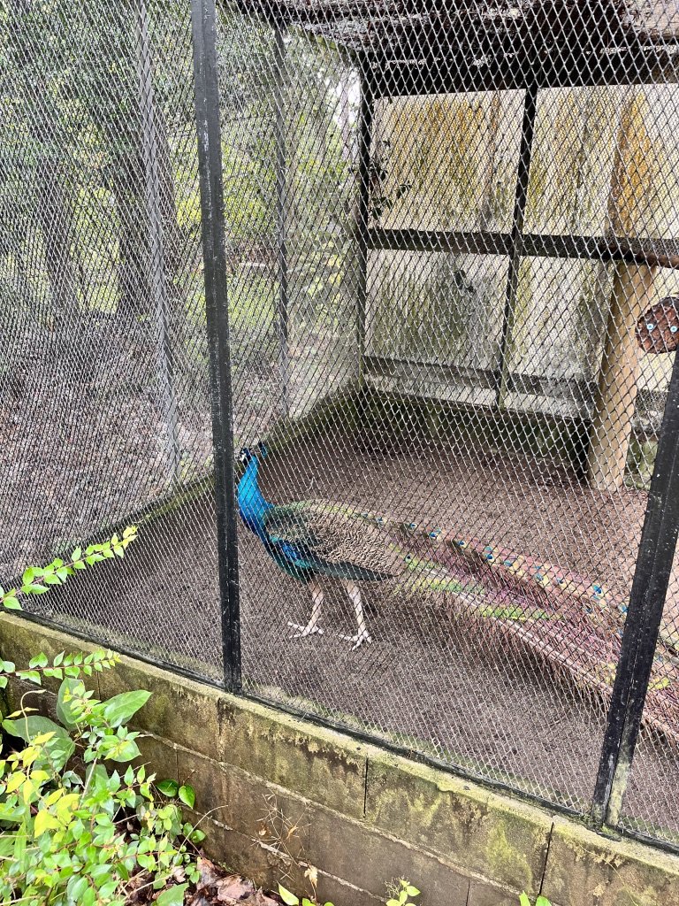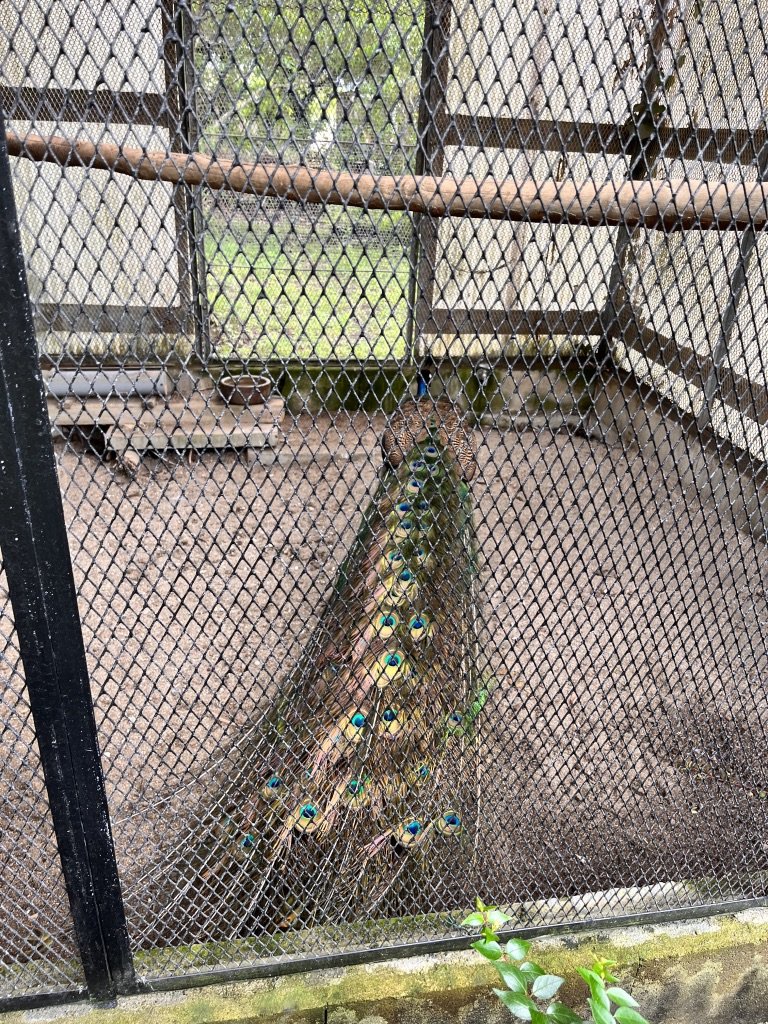 なんとこの園内には孔雀が小さな檻の中で飼われているようである。