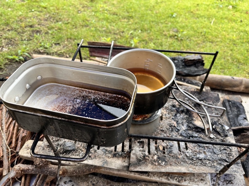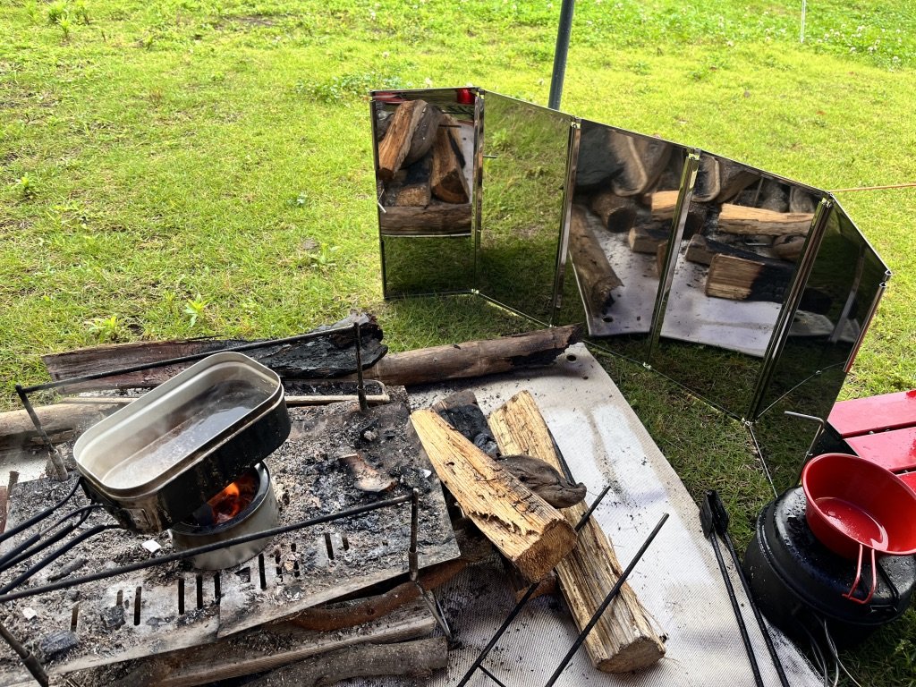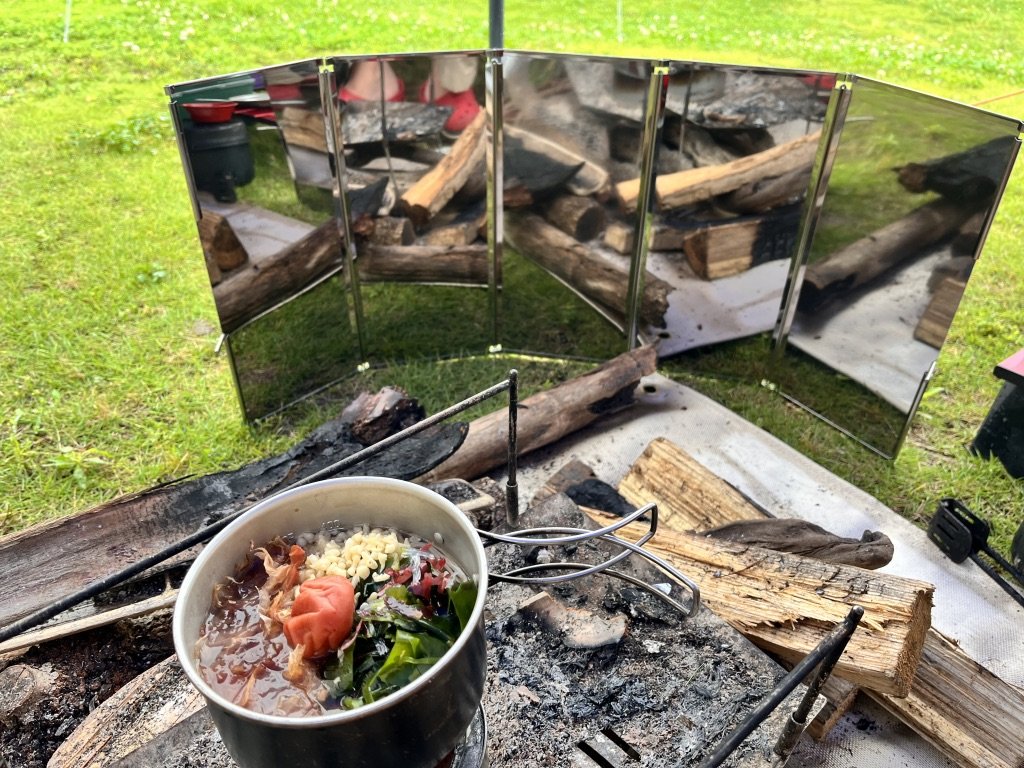 今回の旅で初めて持ってきたキャプテンスタッグのウィンドスクリーンを置いて焚き火を守りつつ、本日の朝飯を終えることにしよう。